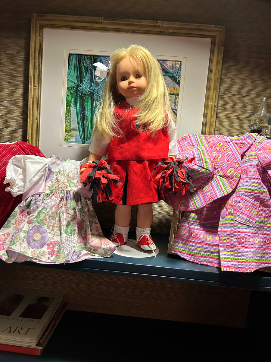 Introducing a stunning 19" Gotz Doll with beautiful blonde hair, perfect for collectors and doll children alike. This one of a kind doll comes with custom made outfits, including a University of Georgia cheerleading outfit. This Gotz Doll embodies quality craftsmanship and attention to detail, making it a wonderful addition to any doll collection.