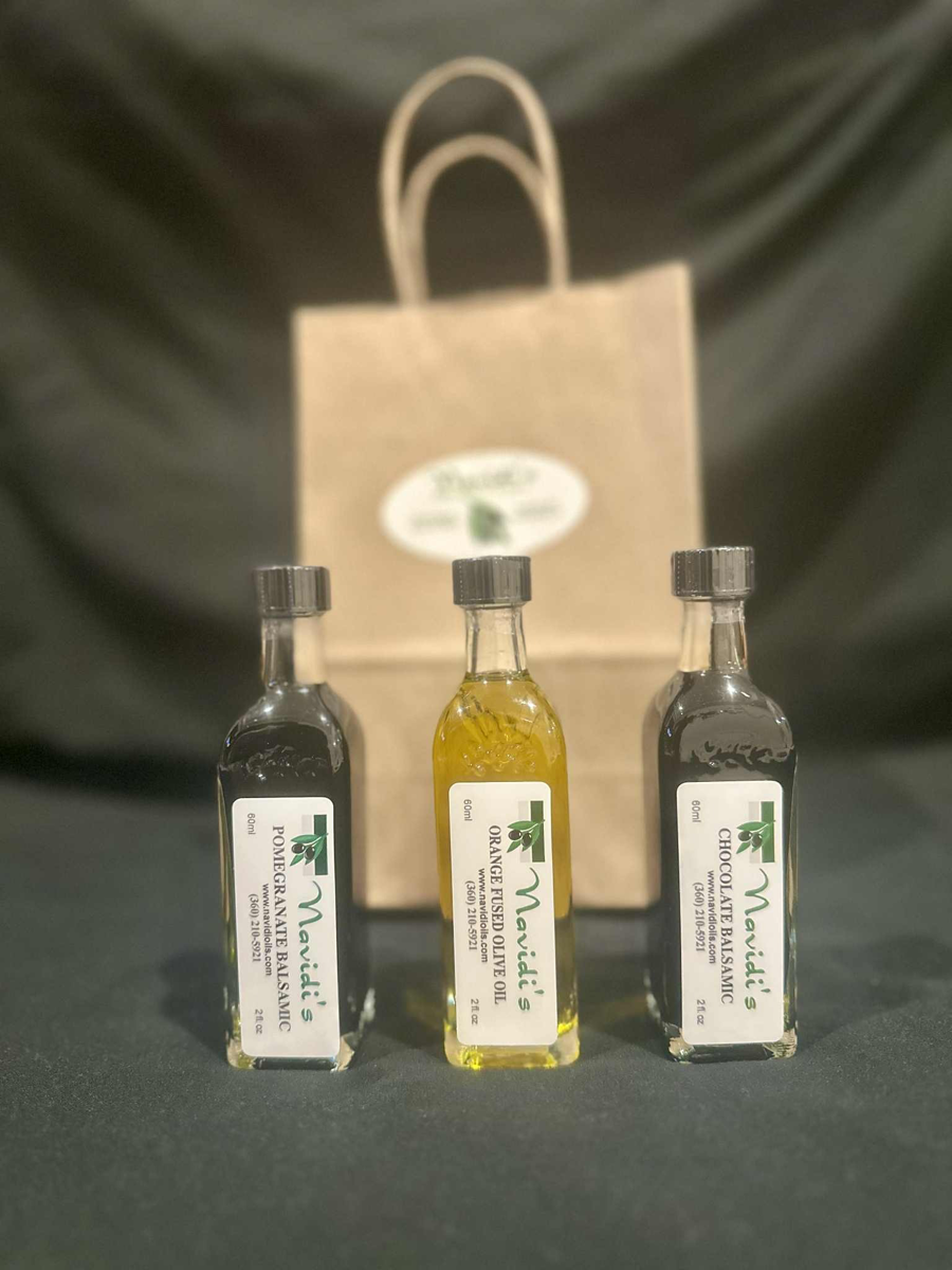 Elevate your culinary creations with this delicious trio of artisan flavors from Navidi’s Oil & Vinegar in Camas! This gourmet set includes: 2 oz Navel Orange Olive Oil – Bright, citrusy, and perfect for salads or seafood. 2 oz Pomegranate Balsamic – Sweet and tangy, a delightful drizzle over greens or grilled meats. 2 oz Chocolate Balsamic – Rich and decadent, amazing on desserts, berries, or even ice cream! Whether you’re a seasoned home chef or just love experimenting in the kitchen, this flavor-packed sampler is sure to inspire creativity and add a touch of elegance to any meal. Details: 🫒 Three 2 oz bottles (Navel Orange Olive Oil, Pomegranate Balsamic, Chocolate Balsamic) 🏡 From Navidi’s Oil & Vinegar in Camas, WA 🎁 Perfect for gifting or indulging yourself! Discover the art of flavor with this locally sourced gourmet set!