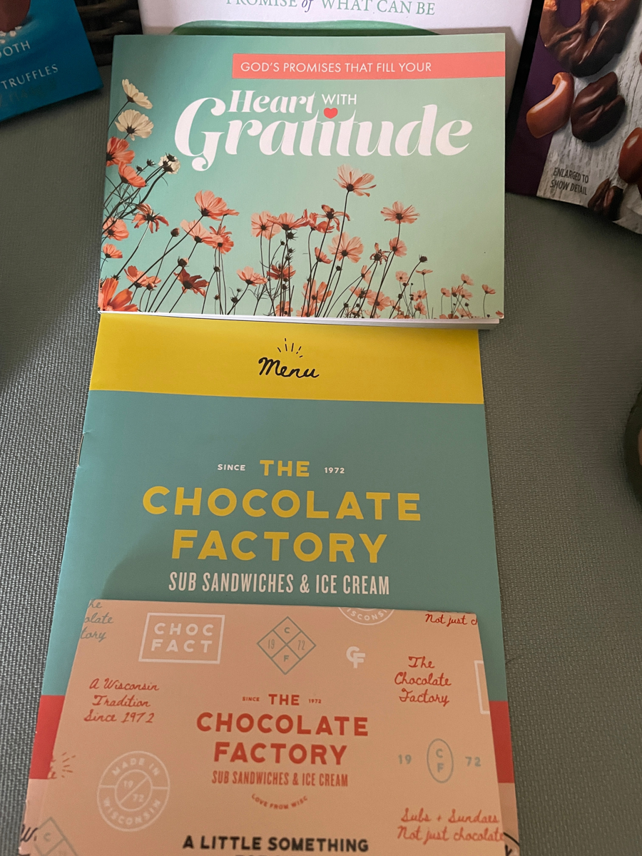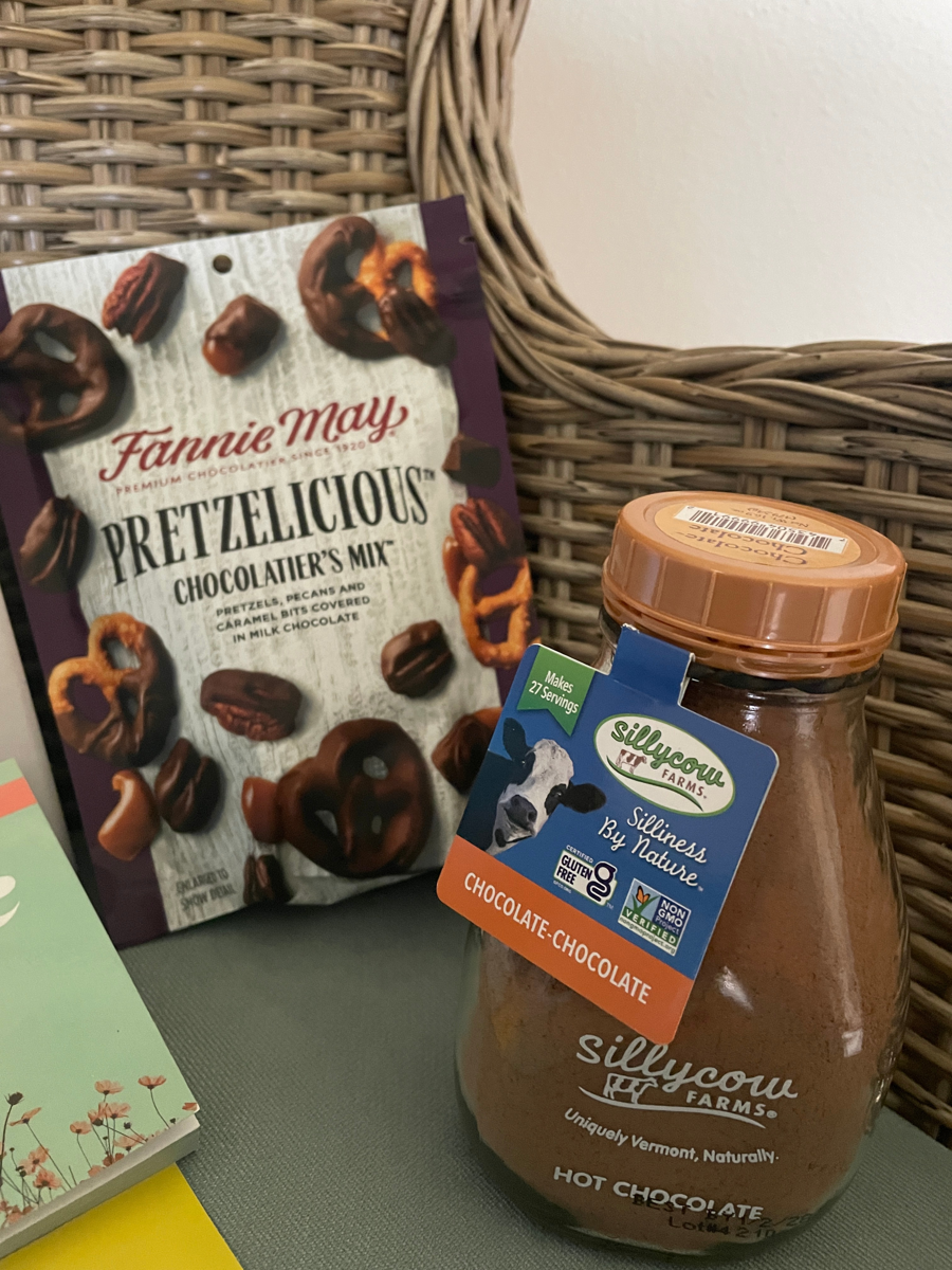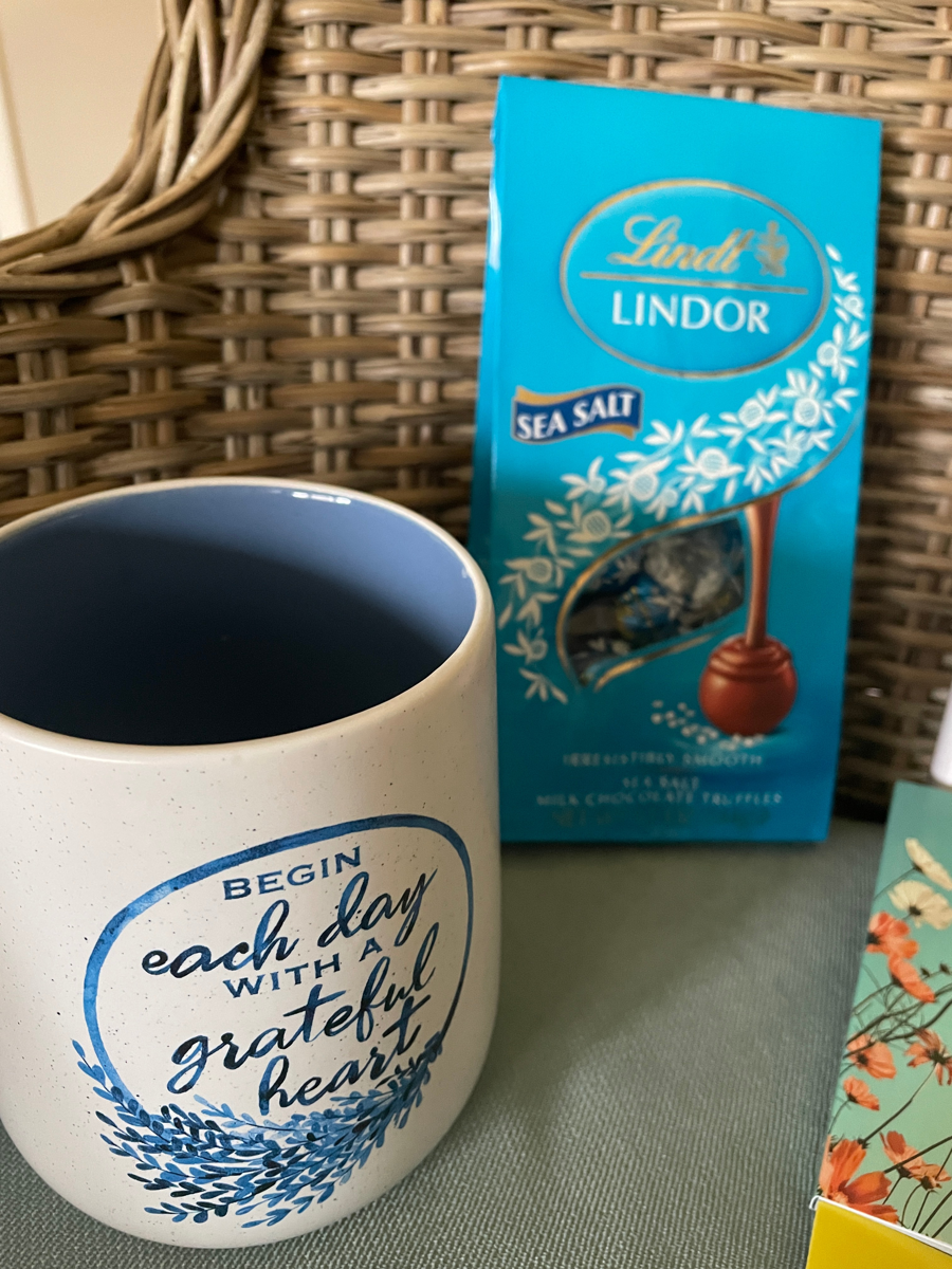 This basket has everything you need to relax and be grateful. 5 oz bag of sea salt milk chocolate truffles, 27 servings of Silly Cow hot cocoa mix, Fannie May chocolate covered pretzels, The "Courage to Change" book by Joyce Meyer, "Heart with Gratitude" promises of God book, a beautiful grateful heart mug, and a $20 gift card to The Chocolate Factory.