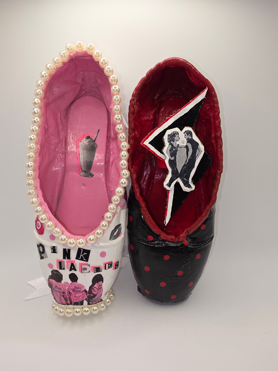 These pointe shoes were inspired by the musical Grease. Designed by Rose.