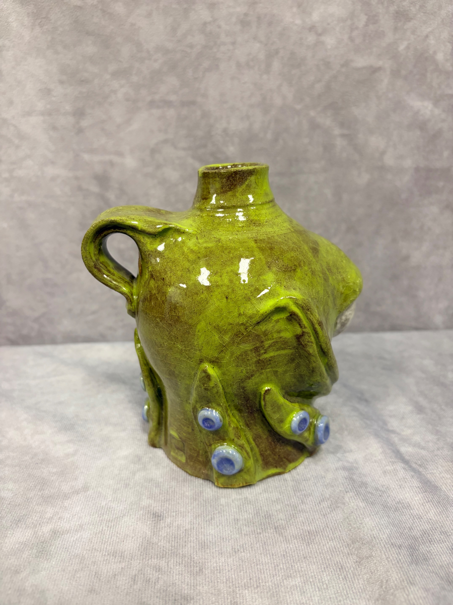 Green Pottery Jug. Dimensions are 6"H x 4"W