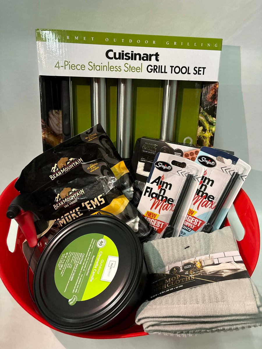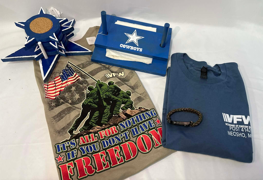 Grill Basket: Bar Mod Dish Clothes, Pot Holder and Oven Mit, Lighters x2, Weber Seasoning, Grill Spray Bottle, Candle, Cuisinart Grill Set, Smokems x2 USA Paracord: Firestarter Bracelet VFW: 2 XL Shirts Merl's Wood Craft: Coasters & Napkin Holder