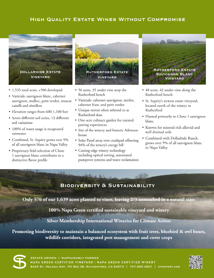 A one-half case (6 bottles) mix of cab, rosé, muscat canelli, two sauv blanc, and the 2019 Élu, Supéry`s premium Bordeaux-style red wine blend layered with fine grain tannin structure and refinement. 100% of St. Supéry wine comes from grapes grown on land owned by the winery in Rutherford, CA. French château tradition rooted in Napa Valley terroir.