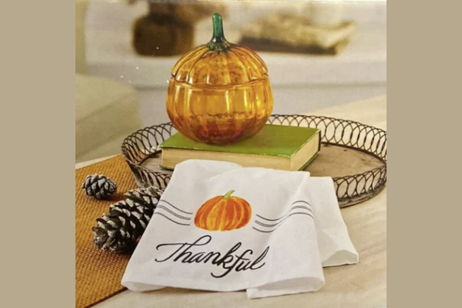🍂 Lovely pumpkin-shaped glass candy dish with lid (5.75" W x 7" H x 5.75" D). 🍂 White cotton tea towel offers a reminder of the season with a screenprinted "thankful" message and pumpkin illustration (18" W x 26" H). 🍂 Marjolein Bastin ceramic salt and pepper shaker set includes a squatty orange pumpkin shaker for salt and a green-striped squash shaker for pepper.