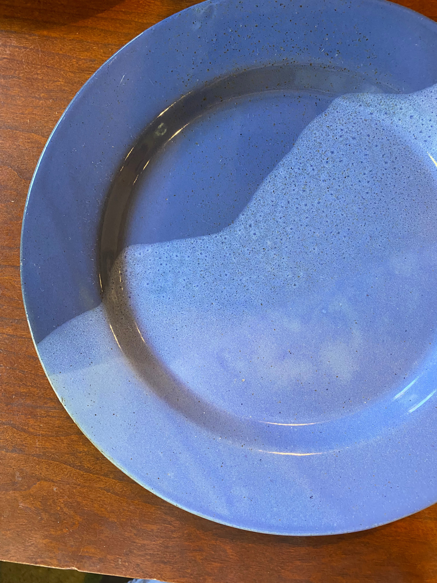 Two blue stoneware dinner plates with a reactive glaze. Handmade by a local artist. Diameter measures 10.25 inches
