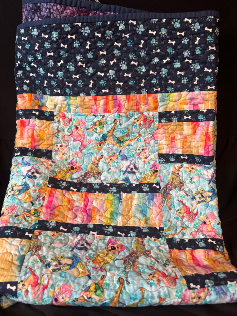 This exquisite hand crafted quilt features a charming dog print, perfect for dog lovers and those who appreciate unique home decor. Each stitch is meticulously made, showcasing the artistry and dedication that goes into creating such a beautiful piece. The quilt not only adds warmth and comfort to any space but also serves as a delightful conversation starter. Whether draped over a sofa or used on a bed, this hand crafted quilt with its playful dog print will bring joy and character to your home. Don't miss the chance to own this one-of-a-kind item that beautifully combines craftsmanship and love for our furry friends.