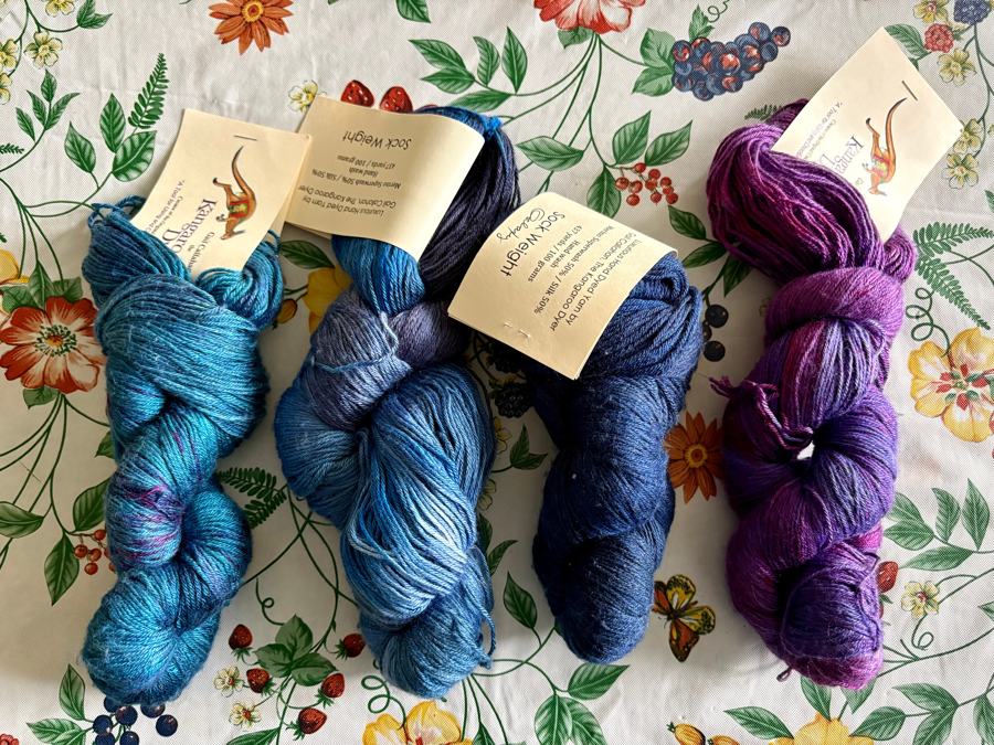 Gail Callahan the Kangaroo Dyer donated 4 skeins of hand dyed yarn, 437 yards each, sock weight, merino superwash 50%/silk 50% and it comes with color charts.