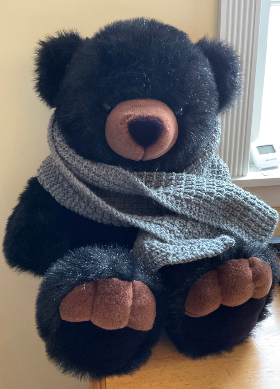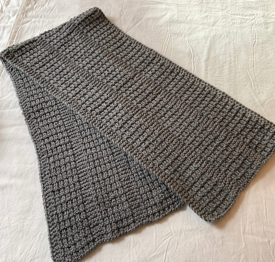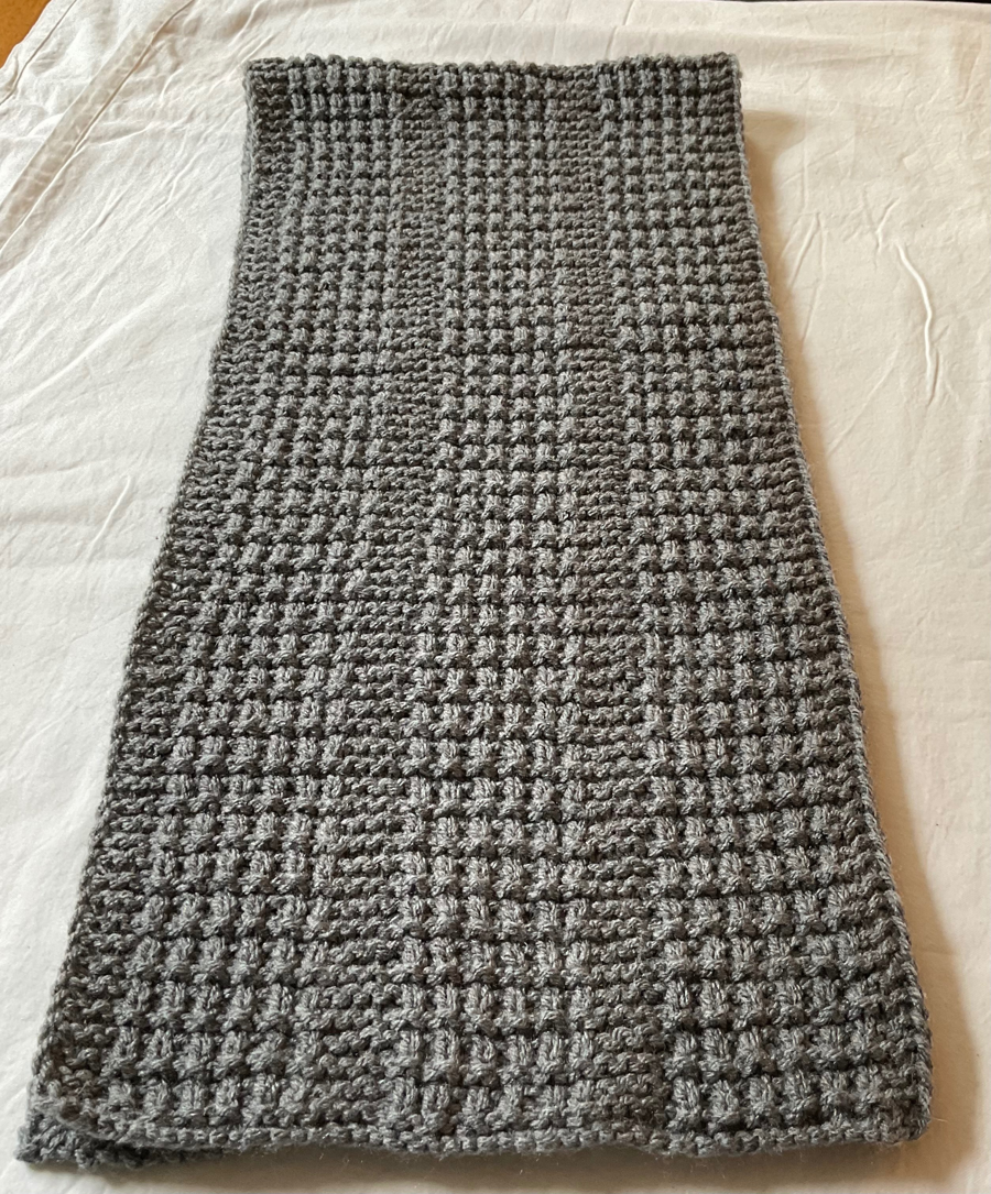 Hand knit gray scarf, 10 by 54 inches, very soft.