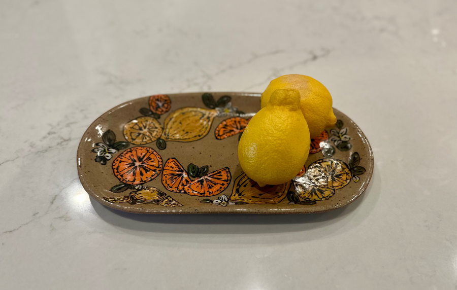Bring a burst of sunshine to your table with this beautifully hand-painted ceramic platter featuring vibrant citrus artwork. Designed and created by LLE parent and ceramic artist Sara Weith of A+S Ceramics, this piece is both functional and display-worthy. Perfect as a serving platter, a statement centerpiece, or a unique gift, this one-of-a-kind piece adds fresh color and artisan charm to any home. A true original to brighten any space!