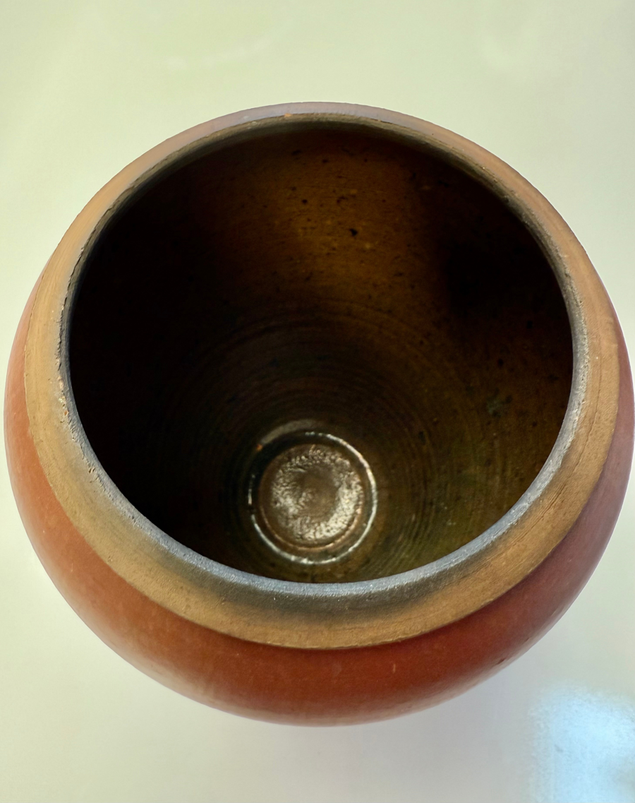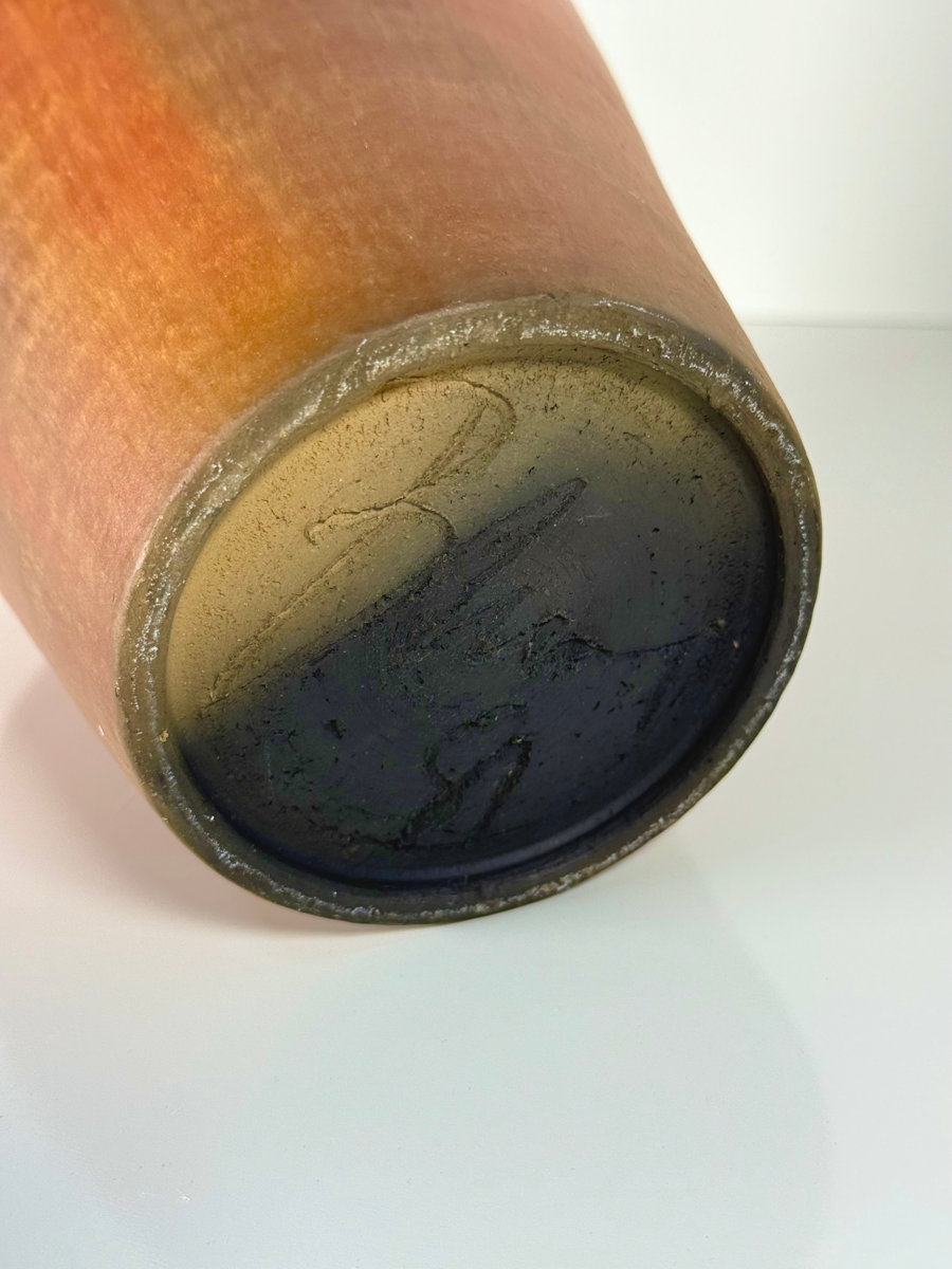 The 8-inch tall vase is an example of Japanese pottery created using the Raku fast-firing process which results in a unique smoky finish.