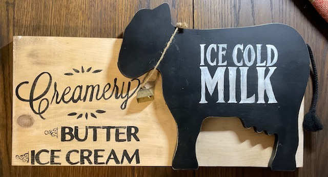 Add cozy, rustic charm to any kitchen, pantry, or dining space with this handmade farmhouse-style wall piece. Featuring a painted cow silhouette reading “Ice Cold Milk” paired with a coordinating wooden sign that says “Creamery • Butter • Ice Cream,” this piece celebrates classic dairy-farm nostalgia.