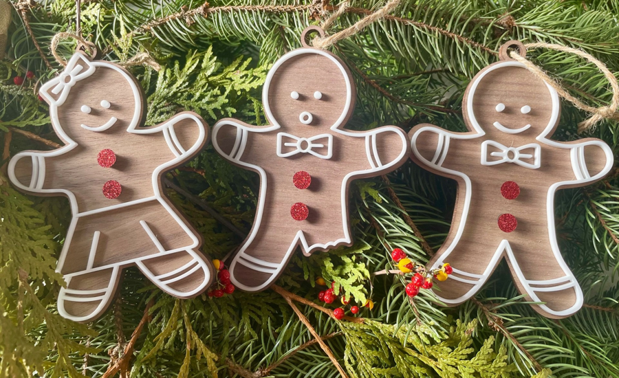Bring festive cheer to your tree with this charming set of three handcrafted gingerbread ornaments, lovingly made by local artisan Chris Goyer. Each ornament features layered wood, crisp detailing, and a pop of holiday sparkle on their buttons. These pieces are durable, whimsical, and full of personality — perfect for families and holiday lovers alike. Includes: 👧 Gingerbread girl with bow 👦 Gingerbread child 👔 Gingerbread boy with bow tie A delightful trio that brightens any holiday display. Selling price: $12 per ornament ($36 total).