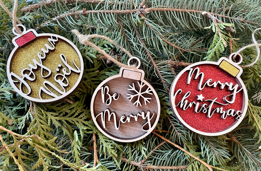 Bring festive sparkle to your tree with this beautiful set of three handcrafted bauble ornaments, lovingly made by local artisan Chris Goyer. Each ornament features layered wood, crisp lettering, glittery backing, and warm holiday tones that catch the light beautifully. Durable, elegant, and full of charm — perfect for any holiday decorator. Includes: ✨ Joyeux Noël bauble (gold glitter) ❄️ Be Merry bauble (natural wood) 🎅 Merry Christmas bauble (red glitter) A stunning trio that adds warmth and personality to any tree. Selling price: $12 per ornament ($36 total).