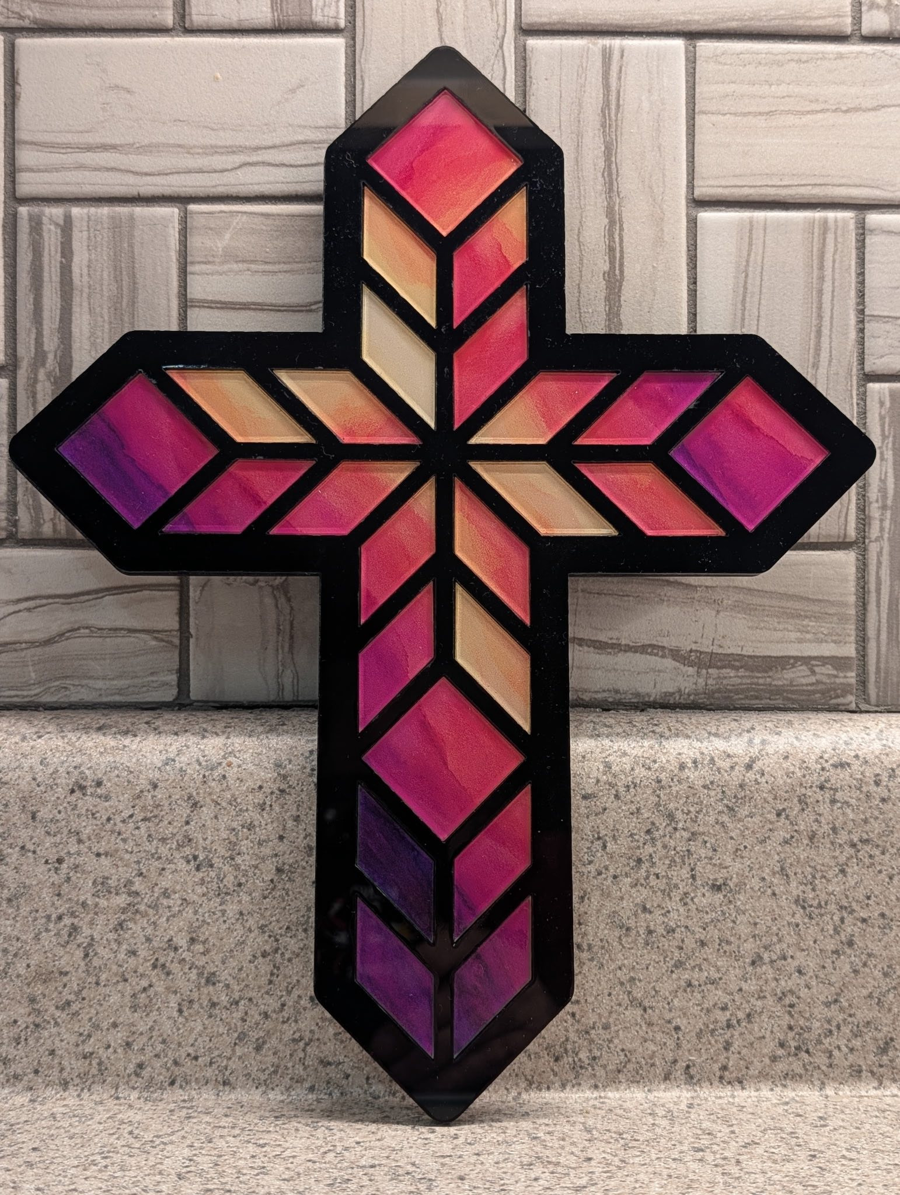 Bring warmth, faith, and beauty into your home with this stunning handcrafted wood and acrylic cross. Measuring 12" x 9.5", this piece features vibrant layered acrylic in rich shades of pink, coral, gold, and purple set against a sleek black wood frame.