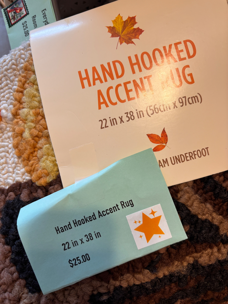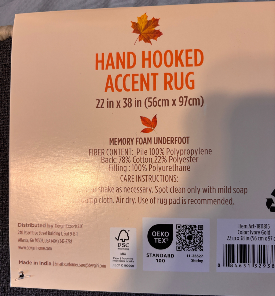 Lovely accent rug in fall colors featuring a cardinal and an oriole. The rug contains memory foam, which makes it very comfortable underfoot! Measures 22 by 38 inches. Spot clean with mild soap and damp cloth. Air dry.