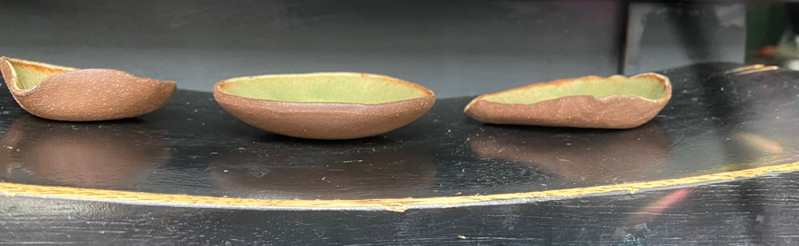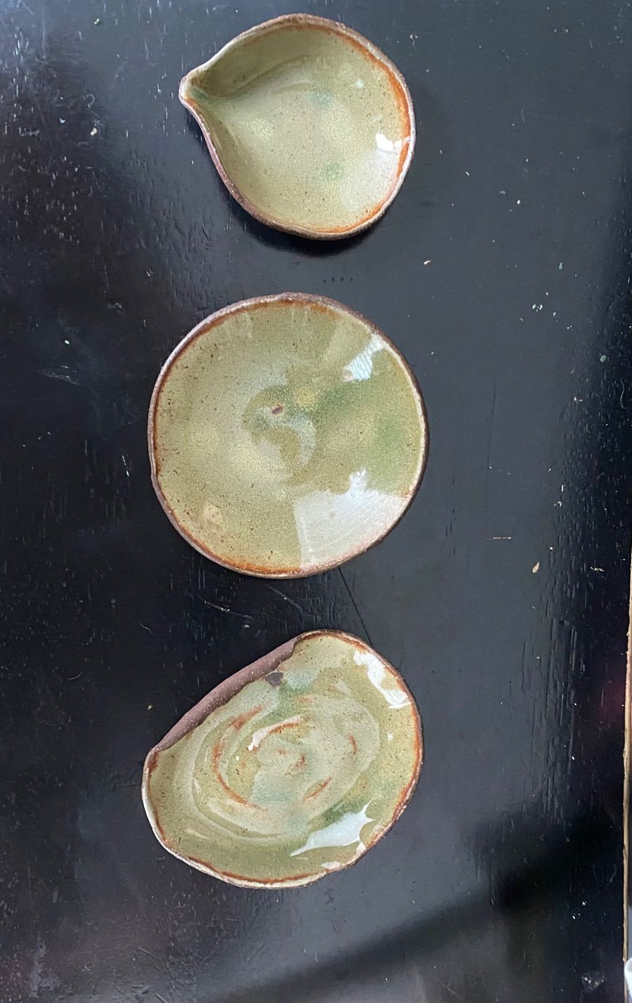 Beautiful bowls to showcase jewlery....spices...salt....or small nicknacks. 3 1/2 x 3 1/2 oval 3x4 long one 3x2 1/2 one with little pour spout