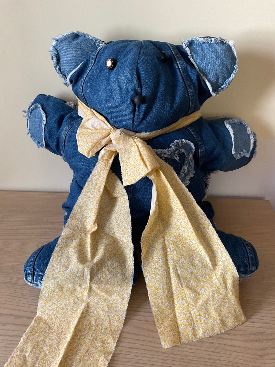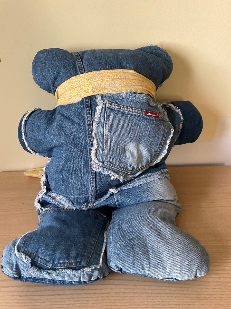 Handmade teddy bear made out of jeans with a fabric scarf. 27 in x 22 in x 8 in.