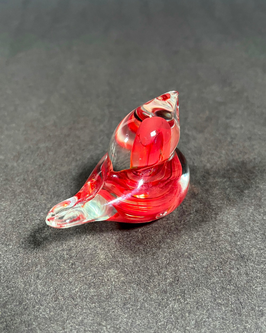 A handmade glass bird by local Portland Artist, Maria Crouch. Measures aprox 2" x 3". Maria Crouch enjoys many different crafts, including beading. She has recently taken up glassblowing and is making a concerted effort to develop her skills. She finds it fascinating and challenging.