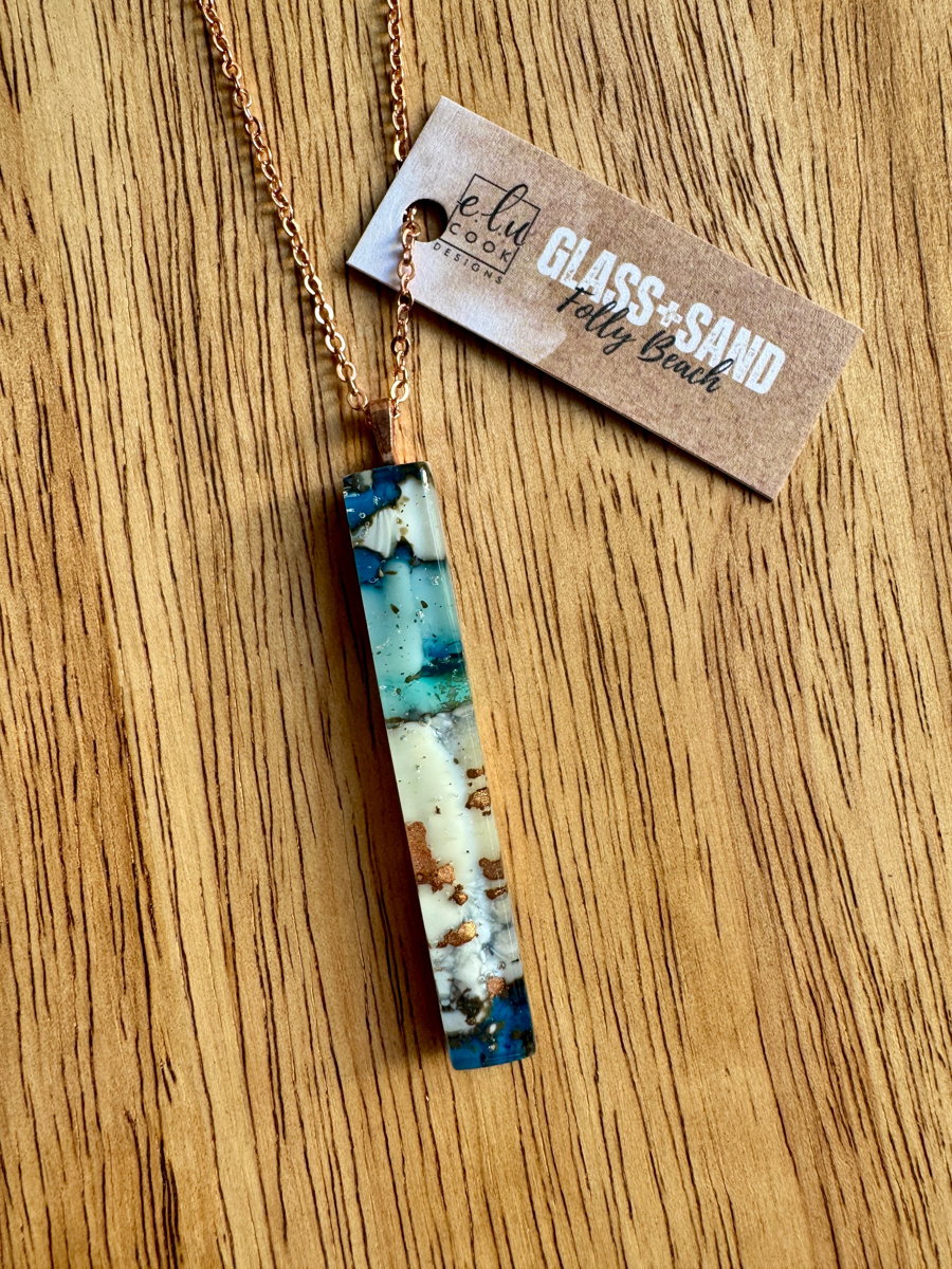Each piece of glasswork is custom designed and created by local artist Emily L.U. Cook in Mt. Pleasant, SC. For this beautiful glass pendant, she used pieces of glass and sand from Folly Beach to create a one-of-a-kind treasure.