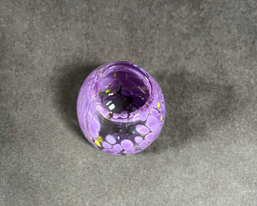 A handmade glass vase by local Portland Artist, Maria Crouch. Measures aprox 2" wide by 2.25" tall". Maria Crouch enjoys many different crafts, including beading. She has recently taken up glassblowing and is making a concerted effort to develop her skills. She finds it fascinating and challenging.