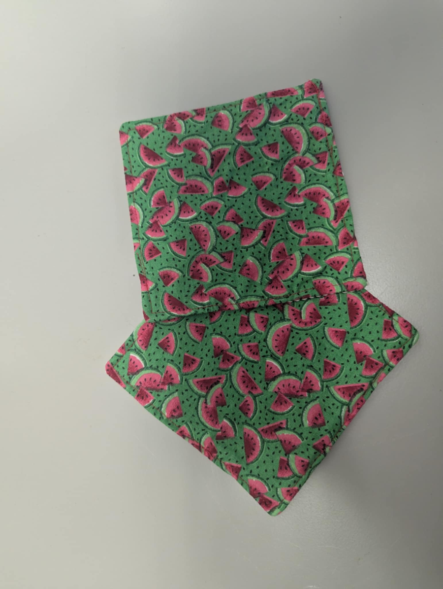 2 x handmade cotton and silicone jar openers with watermelon pattern. Could also be used for placing or carrying hot dishes.