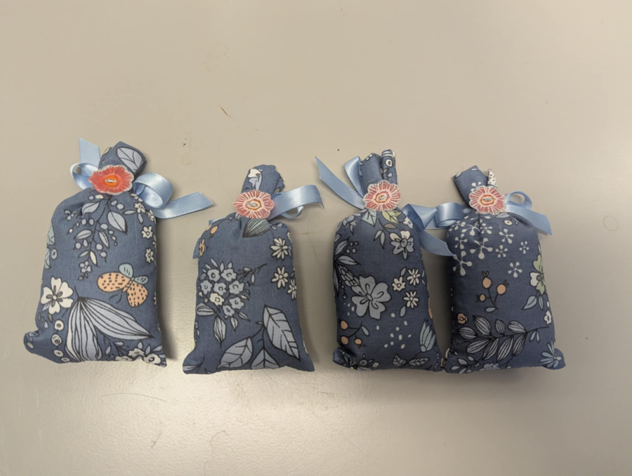 Made by our very own sewing class! 4 x handmade lavender filled sachets with gray floral pattern.