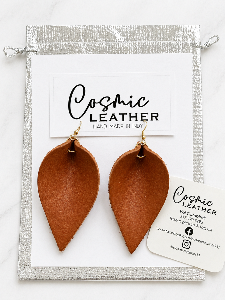 Elevate your style with these stunning handcrafted leather earrings from Cosmic Leather, proudly made in Indianapolis.