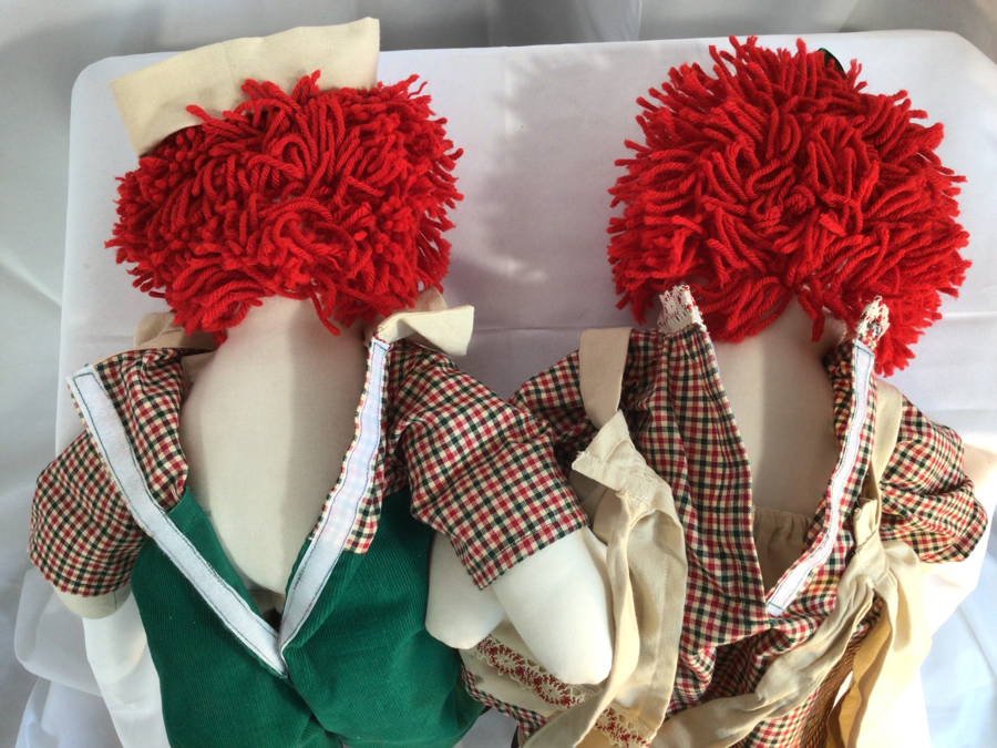 Newly and beautifully handmade by donor. Removable clothing with Velcro closures Compare this handmade duo to an equivalent of Handmade site like Etsy- Priceless! A perfect gift. Andy stands about 25” tall, while Ann is 24”.