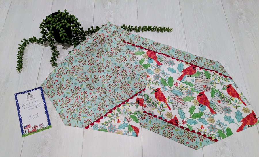 Add a touch of seasonal charm to your home with this handmade reversible winter/holiday table runner, measuring 39" x 12". Its festive design is perfect for dressing up your dining table, sideboard, or coffee table. With two looks in one, it’s versatile for all your holiday gatherings! A special thank you to Debra for this beautiful and festive donation!