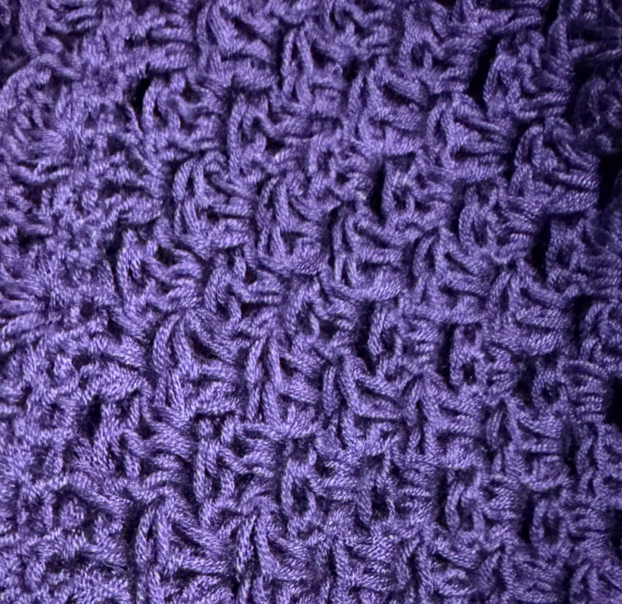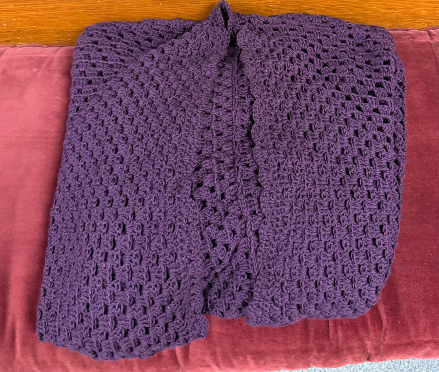 This is a beautiful purple hand-made shawl with scalloped edges shaped to drape over your shoulders and arms, or slide your arms through the loose sleeves. It’s perfect to snuggle under on a cold winter day; while reading a good book, sipping a glass of your favorite wine, or BOTH!