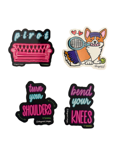 Upcycled tennis ball bouquet, Each “petal” is hand-cut from recycled tennis balls, and the leaves are made from delicate crepe paper Tennis racket and white gem necklace, 14k gold-fill and CZ Tennis themed Vinyl Sticker 4pack
