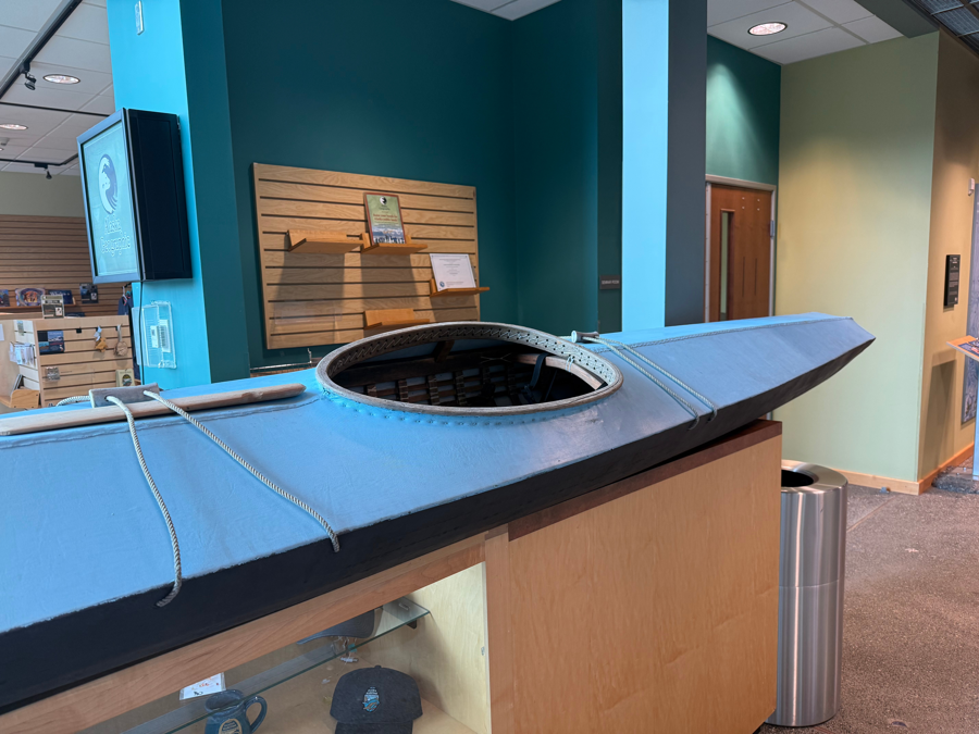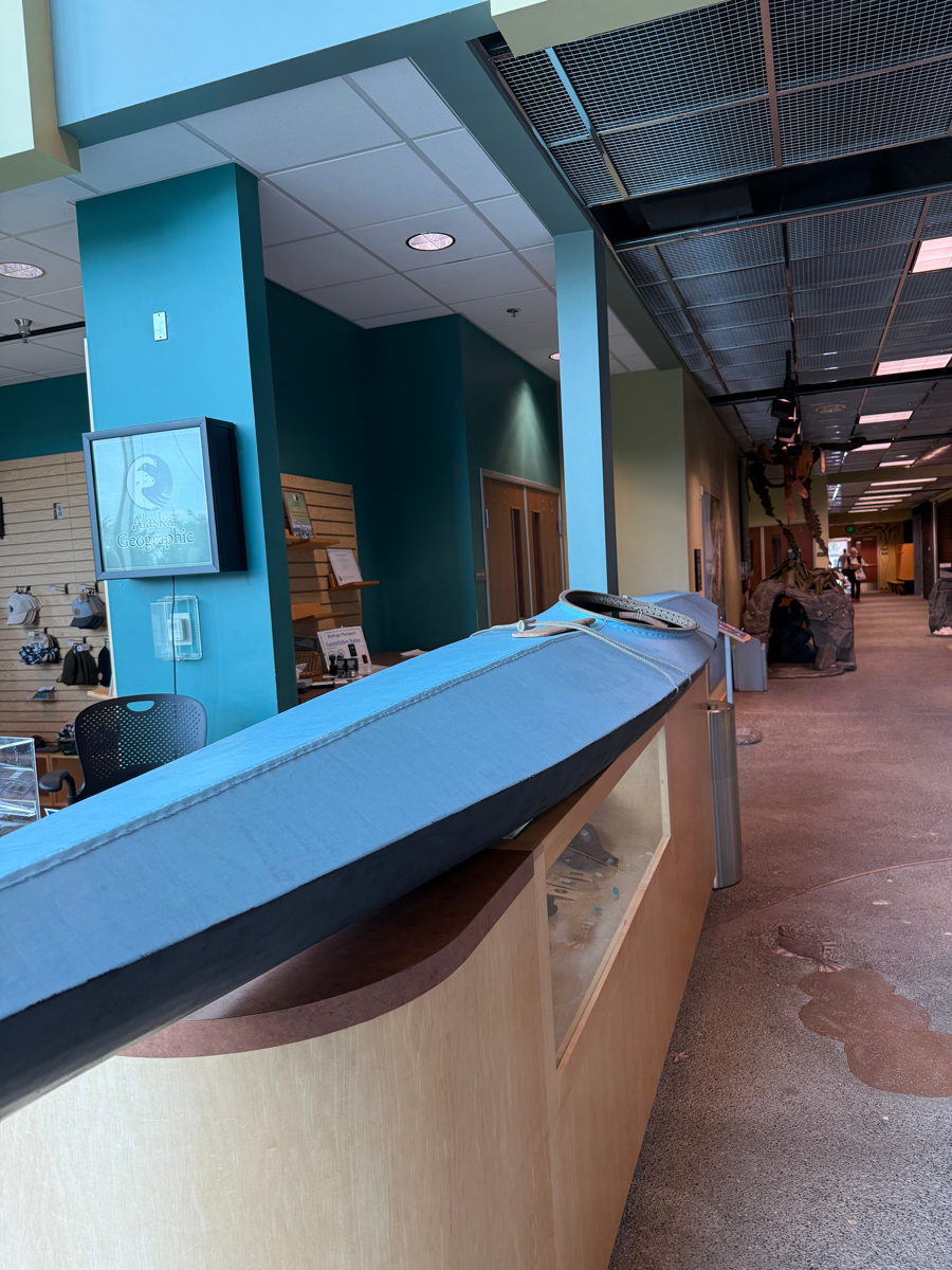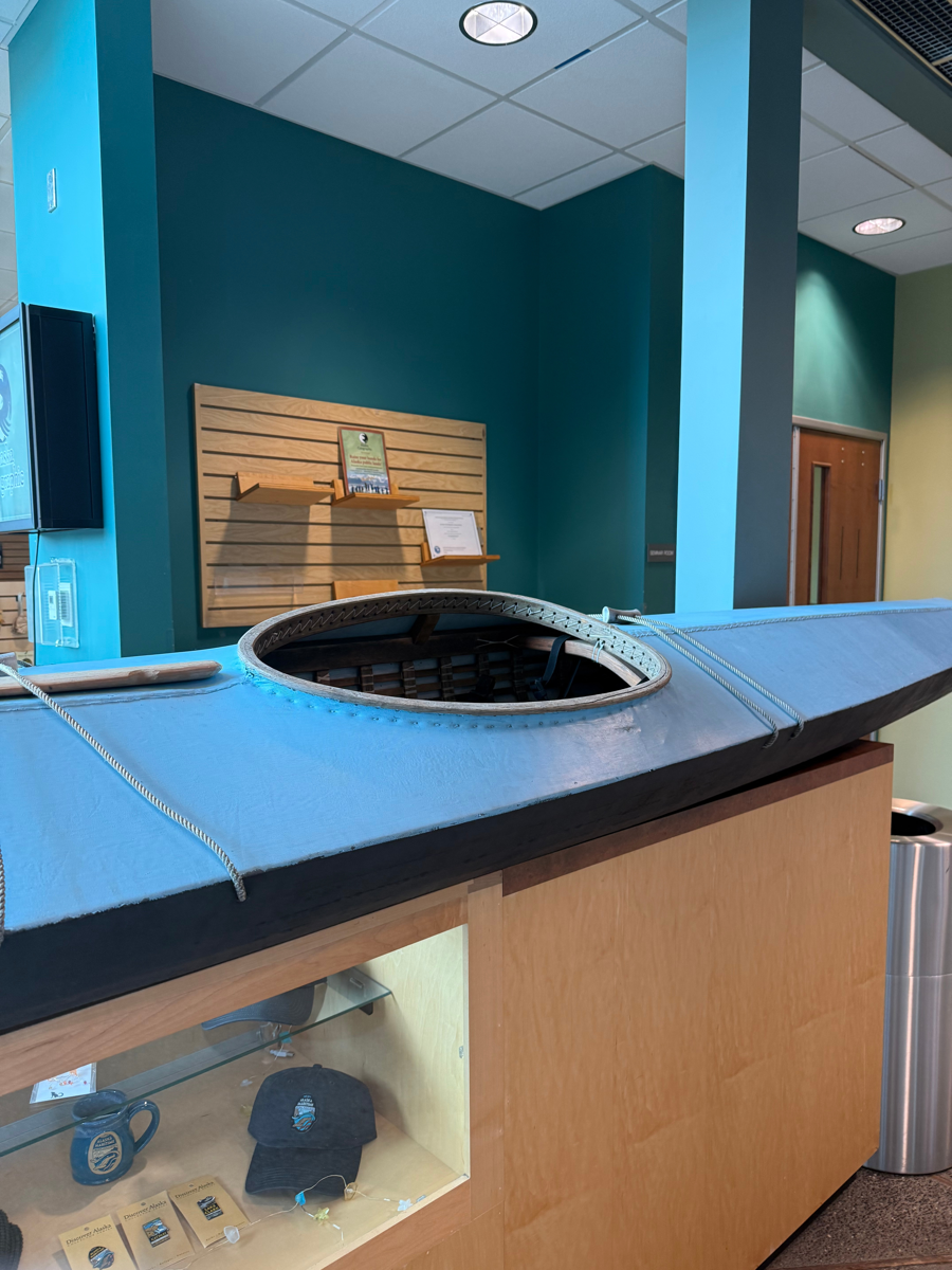 The traditional Unangan kayak, or iqyax (often called a bidarka), is a highly specialized skin-on-frame vessel designed for the treacherous waters of the Aleutian Islands. This beautiful kayak was handmade on Saint Paul Island with a wood frame and reclaimed airplane fabric.