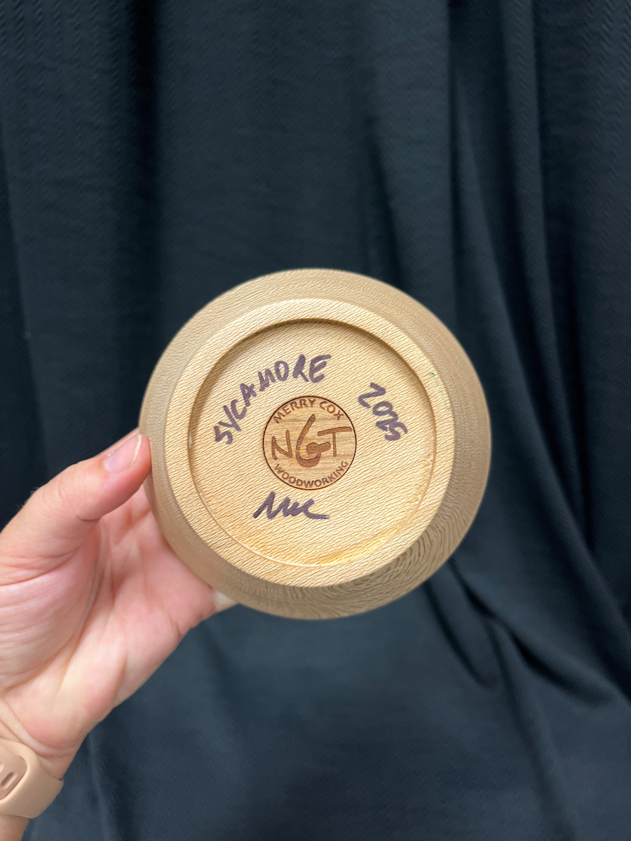 These items are from Merry Cox Woodworking and Morgan Beads, and they're beautiful! A handmade sycamore bowl, and a set of glass earrings.