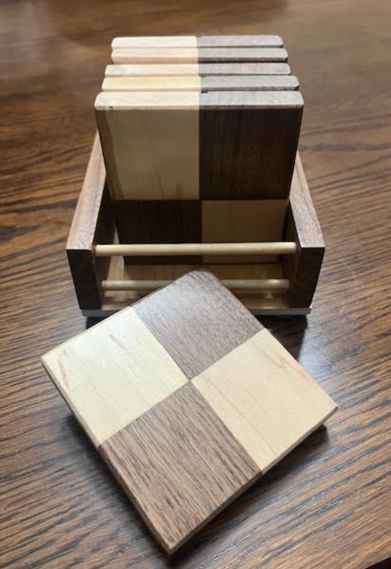 6 handmade wooden coasters, meticulously crafted by Mrs.Throneburg's husband! Elevate your home decor and protect your surfaces. This set includes a beautifully designed holder, making it easy to store and display these unique coasters.