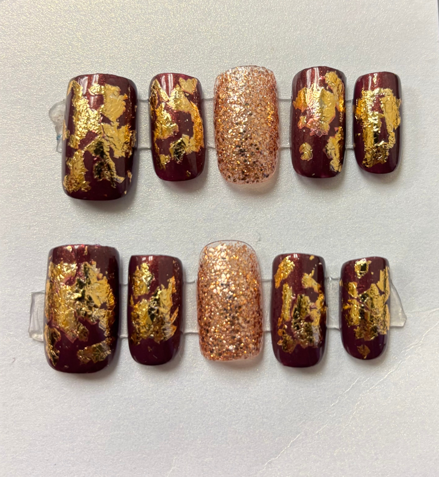 Just glue and go with these beautifully hand-painted acrylic nails! The nails were carefully painted by NWMS parent, Melanie Stewart, and feature a burgundy, pink and gold color palette...perfect for the holiday season!