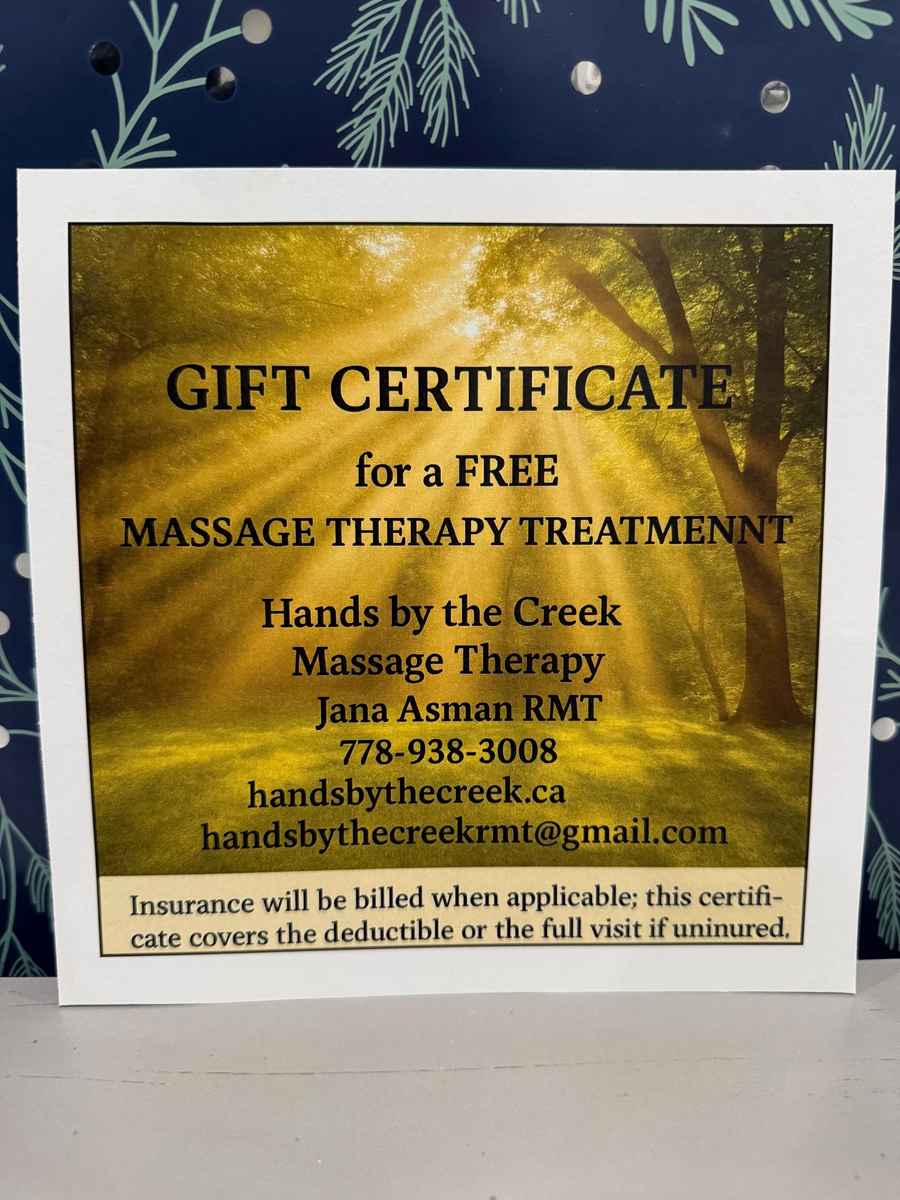 Experience the soothing touch of Hands by the Creek Massage Therapy with a free one hour session designed to rejuvenate your body and mind. Immerse yourself in a tranquil environment where a skilled therapist use various techniques to alleviate stress and promote relaxation. This complimentary session is the perfect opportunity to discover the benefits of massage therapy, whether you're seeking relief from tension, recovery from physical activity, or simply a moment of peace. Don't miss this chance to indulge in self-care and enhance your well-being with a free massage therapy session. Donated by Jana with Hands by the Creek Massage Therapy