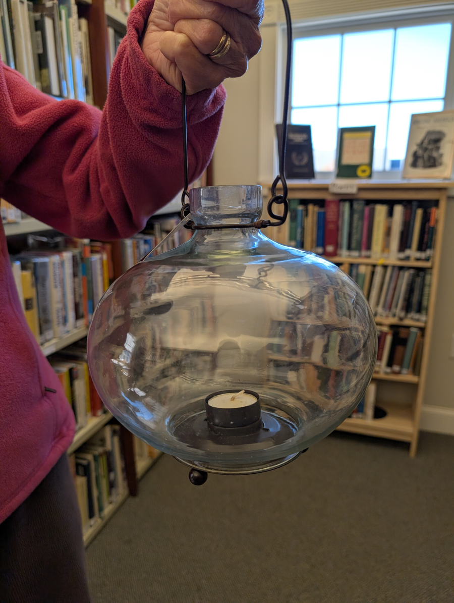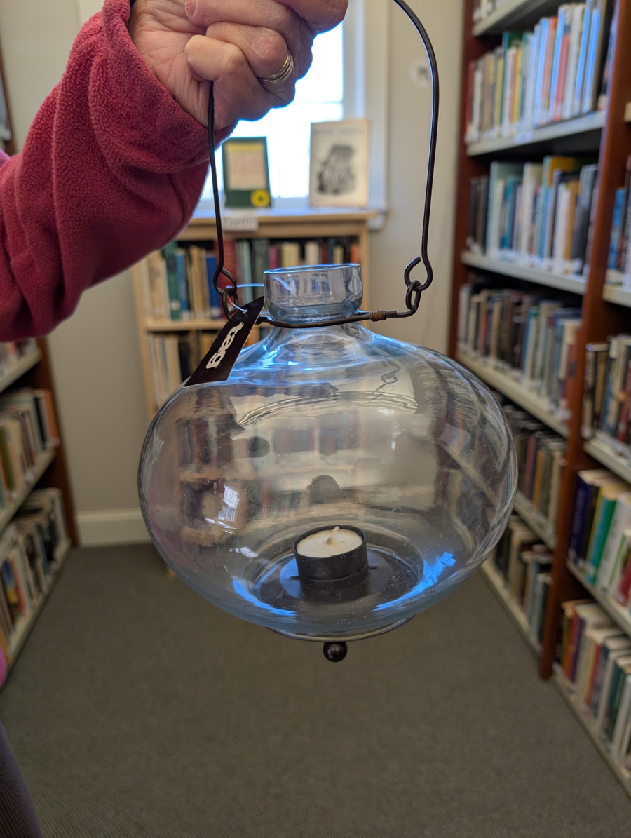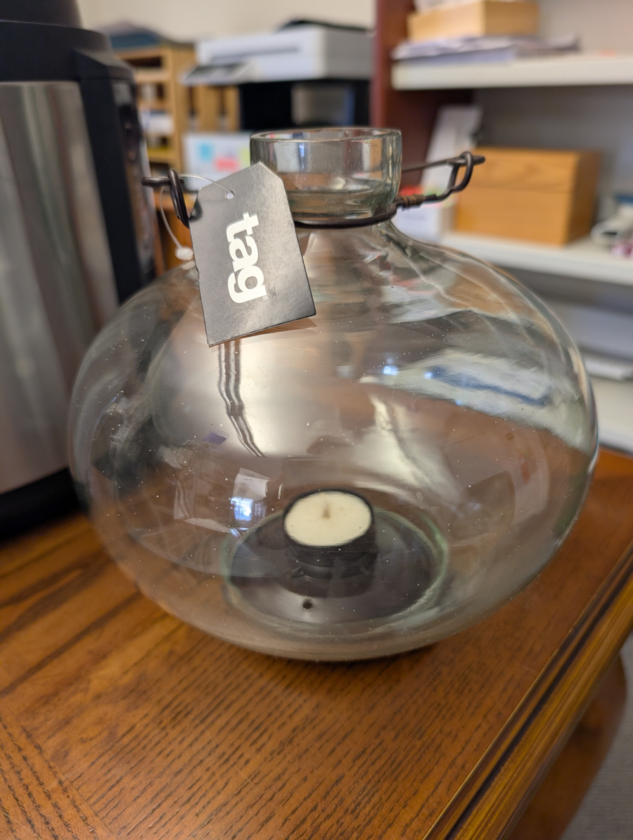 Glass with a wire handle. 7.5 in by 7.75 in. Holds standard tealights.