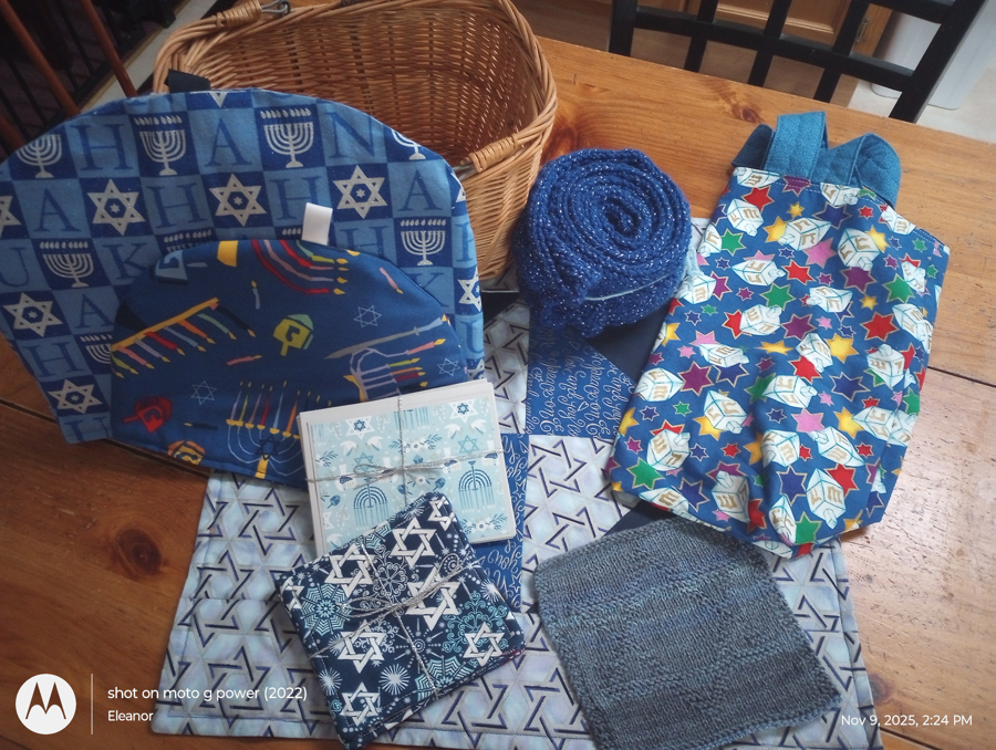 This recycled basket includes the 8 days of gifts: a small centerpiece table quilt, a large tea cozy, a small tea cozy, a reversible tote bag, a knitted dish cloth, 4 handmade paper crafted Hanukkah cards, 4 quilted cotton coasters, and a knitted scarf.