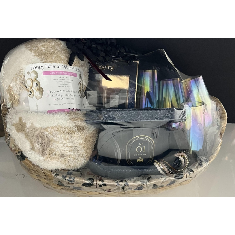 Kick off a memorable evening with an exclusive Happy Hour experience at Milk and Honey, a boutique wine bar and event venue. This experience includes a private party for you and nine friends, one free drink per attending guest, and 15% off shopping—perfect for a fun night out or special celebration. To enjoy long after happy hour, this basket also includes a plush throw blanket, BPA-free stemless Sun Squad champagne glasses, a No. 1 NINETY SIX candle, beaded bracelets, a leather jewelry box, a leather-bound notebook, and Finery perfume and candle. A beautiful blend of experience, comfort, and style.
