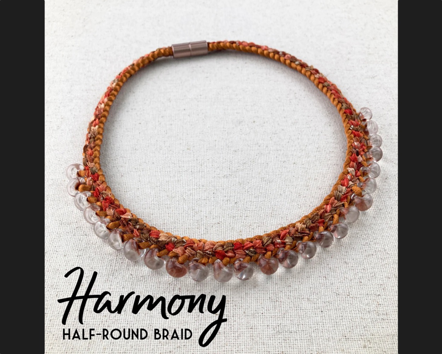 In the Harmony necklace the teardrop beads hang gracefully from the edge of the braid; their size and shape compliment the texture of the braid and enhance it. The smooth round satin cord provides structure, strength, and stability to the braid while the variegated adds delightfully shifting colors and metallic accents. This kit includes materials and step-by-step instructions. Tools, braiding disk, etc. are not included.