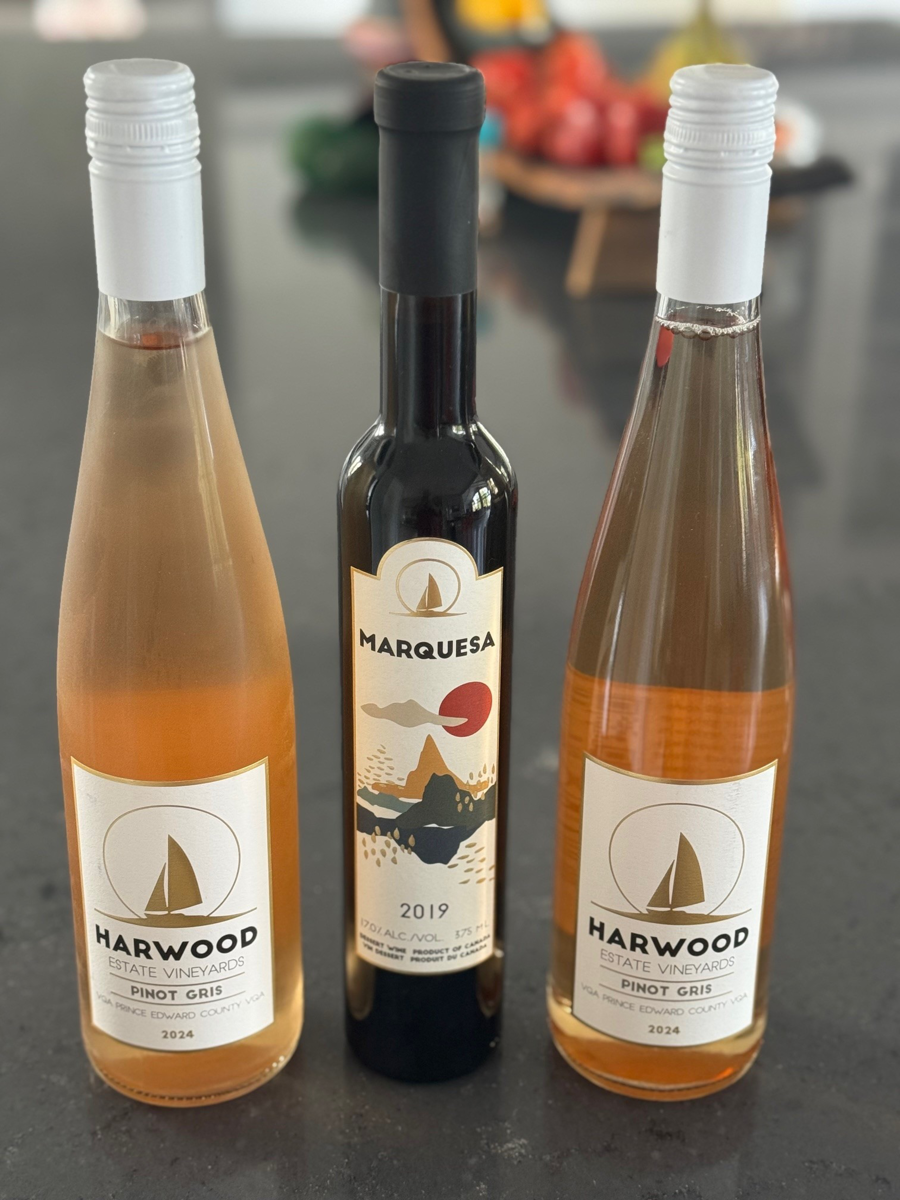 Two bottles of Harwood Estate's amazing Pinot Gris and one bottle of their Maquesa (a fortified wine made from Marquette grapes). Great for bringing to those holiday parties or sipping in front of the fireplace.
