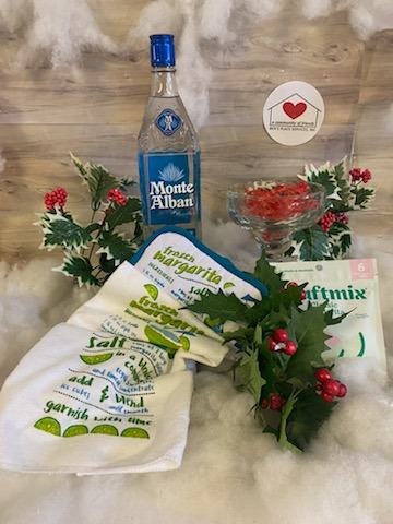 A bottle of Monte Alban Tequila that goes down smooth paired with margarita mix, a margarita glass, and a margarita towel.