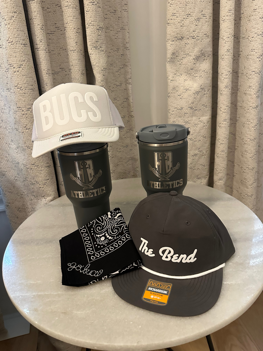 Be ready to cheer on your favorite Buccaneer athlete! This package includes two 30 ounce tumblers, 2 hats (white is Otto and grey is Richardson) and a black embroidered bandana. GO BUCS!!
