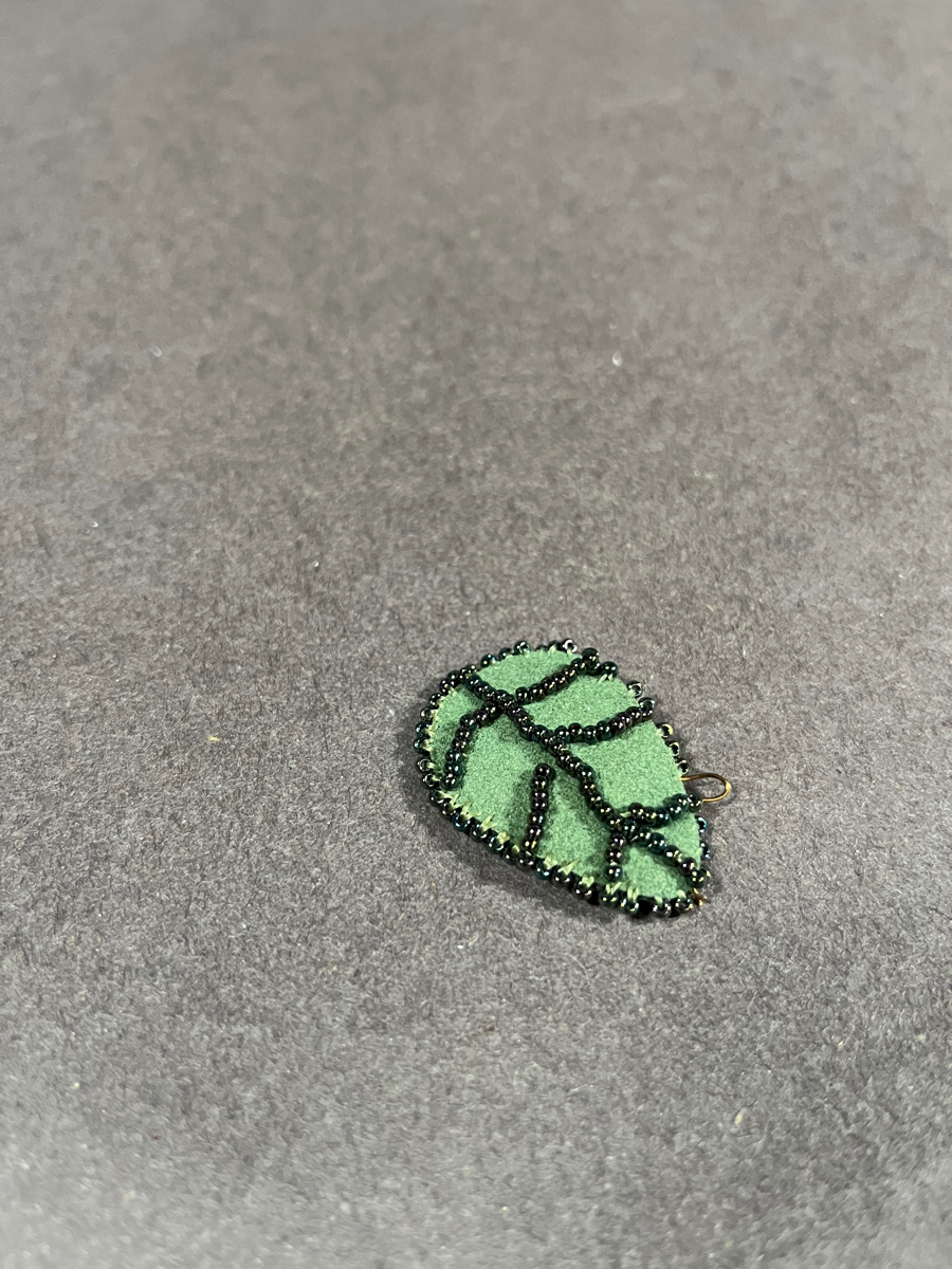 This suede and beaded leaf looks plucked from a midsummer afternoon, the last to be pulled.