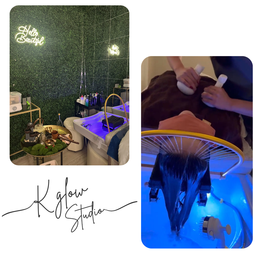 Discover the Korean Touch with this Head Spa (scalp scaling), which is part of a deeply relaxing Aura Du ritual with a warm mist herbal touch at K Glow Spa located at 5162 Kanan Road, Agoura Hills, CA 91301.
