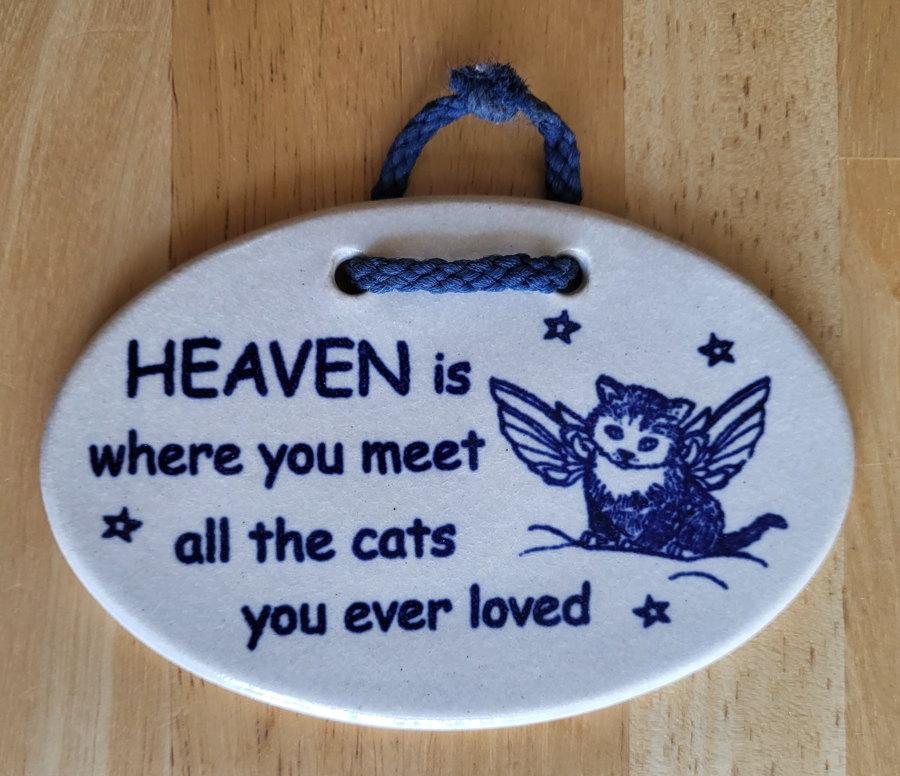 "HEAVEN is where you meet all the cats you ever loved" says it PURRfectly! Sweet blue kitty angel and stars complete this lovely hand made 5.5" x 3.5" tan oval plaque from Mountain Meadow Pottery.