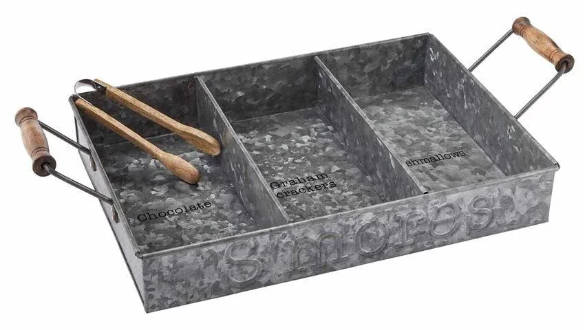 A delightful 2-piece tray set designed for your s'mores-making adventures. This charming s'mores tin tray features clear lettering for each section of ingredients, making it easy to organize and serve your favorite treats. Accompanied by 5" wooden tongs with comfortable wooden handles, this set allows for easy transport to your fire pit or campsite. The tray measures 2 1/2" x 15" x 11", with each section perfectly sized at 5" x 11". Just imagine carrying this beautifully crafted tray filled with all the gooey goodness down to the fire, ready to create unforgettable memories with family and friends. Shop for the most unique items at Heavenly Outhouse! All your essential non-essentials in one place.