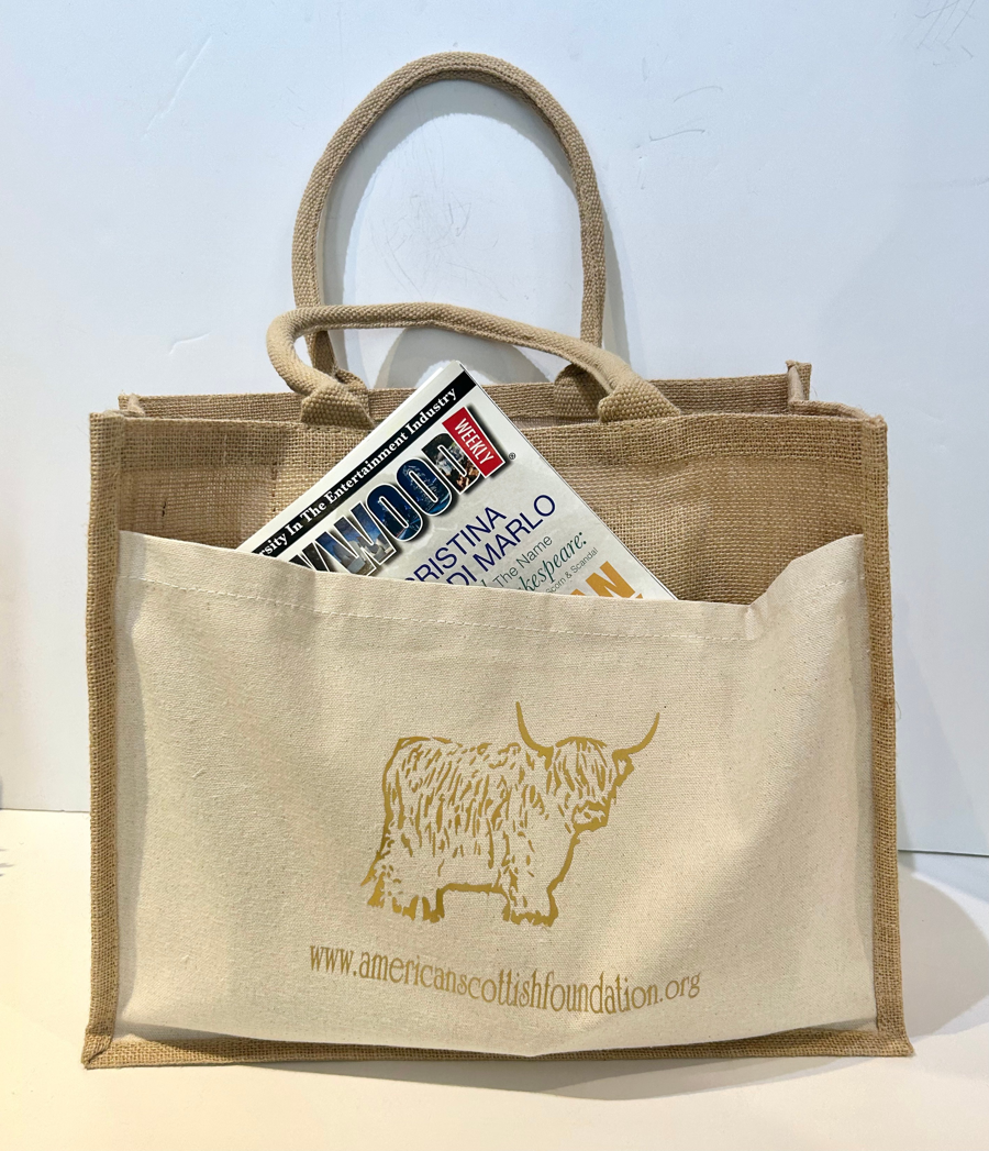 Large Jute Bag with Gold Heilan Coo Design. Printed in Scotland.