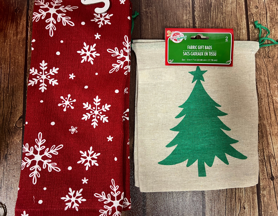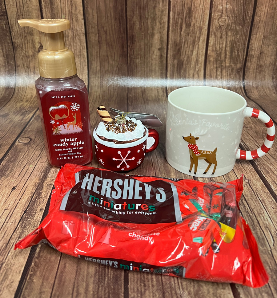 Bath & Body hand soap- 'winter candy apple' reindeer mug, bag of Hershey's chocolates red snowflake hand towel, set of 2 tree gift bags