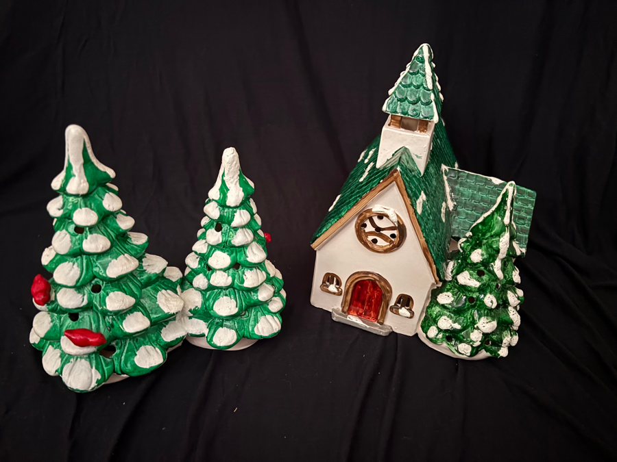 Holiday tabletop decorations with a church and a snowy tree.